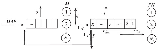 Customers enter the tandem system in the flow defined by the . This arrival process is given by an irreducible Markov chain with continuous time having a finite state space , and matrices and such that the matrix consists of the intensities of transitions of the chain , accompanied by the arrival of a customer. The non-diagonal elements of the matrix determine the intensity of the corresponding transition of the chain without the arrival of a customer, and the modules of the negative diagonal elements determine the intensity of the exit of the process from the corresponding state. The matrix is the generator of the Markov chain