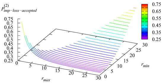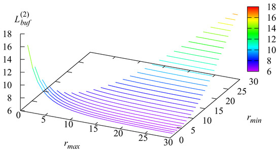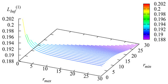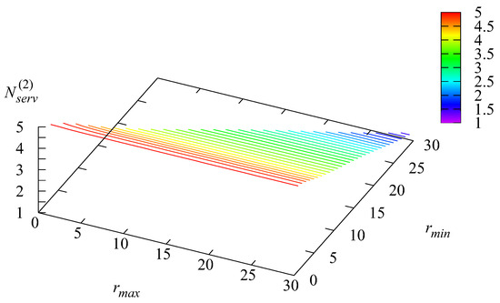 This number achieves its maximum when is small, the advantages of group service are not exploited, and, therefore, more servers of Stage 2 must work. When increases, servers are used more effectively, and the average number of busy servers at Stage 2 decreases. The influence of the threshold in this example is not very significant.