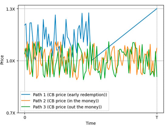- To provide a more intuitive illustration of the pricing process in the LSM model, Figure 1 depicts the simulated price paths in different scenarios. Path 1 represents the path of the convertible bond when early redemption is triggered. Path 2 and Path 3 represent the paths of the convertible bond in the money and out of the money, respectively.
