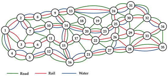 Multimodal network consisting of 35 nodes and 136 arcs [13,41,42].