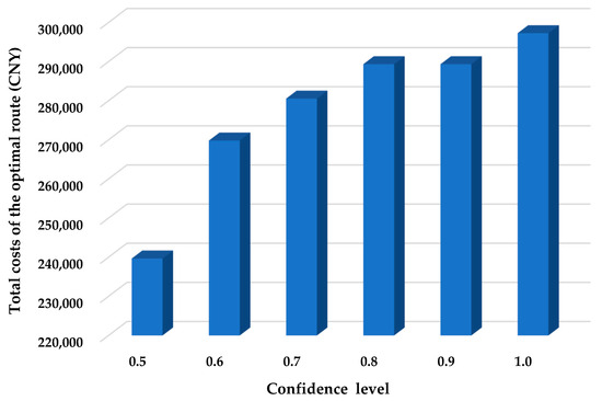As we can see in Figure 2, with the enhancement of the confidence level, the total costs of the optimal route increase, because the increase in confidence level makes the chance constraints (i.e., Equations (25) and (26)) tighter, and further suppresses the feasible solution space of the MRPPDTWCU. Consequently, the best solution given under a smaller confidence level might be found to be infeasible by the model under a larger confidence level. Improving the confidence level helps to make the optimal route more reliable in practical transportation. Therefore, the economy and reliability of the MRPPDTWCU are conflicting. The decision-makers in multimodal transportation including the MTO, shipper, and receiver should make tradeoffs between the two objectives. The sensitivity shown in Figure 2 can provide a reference for them to make a decision.