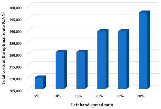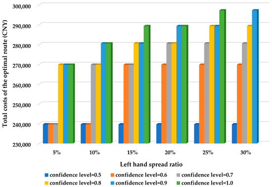 Figure 3 clarifies that improving the spread ratio increases the total costs of the optimal route, which shows a similar change to the variation of the total costs caused by the increase in the confidence level. The reason resulting in the sensitivity shown in Figure 3 is the same as that leading to the variation illustrated by Figure 2, i.e., improving the left hand spread ratio increases and , thereby making the chance constraints tighter and the feasible solution space smaller, and finally increasing the objective values of the optimization model. Since the spread ratio indicates the uncertainty level of the LRTFCs of the multimodal network, Figure 3 demonstrates that the shipper and the receiver need to prepare more budget for a more costly multimodal route to deal with the increasing capacity uncertainty of the multimodal network, so that their containers can be transported successfully from origin to destination.