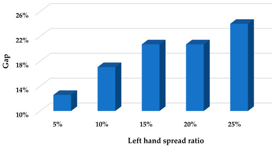 Figure 4 verifies the sensitivities shown in Figure 2 and Figure 3. Furthermore, Figure 4 shows that the degree of increase in total costs of the optimal route caused by improving the confidence level is reduced when the left hand spread ratio becomes smaller, which is clearly illustrated by Figure 5. In Figure 5, the gap is calculated by Equation (29) where and are the total costs of the optimal route when the confidence level is 0.5 and 1.0, respectively.