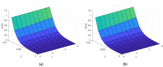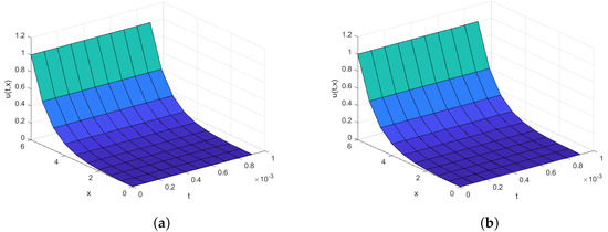 The infinity norms of the proposed HUPFD methods are compared with the UPFD, Crank–Nicolson, and NSFD methods in solving the linear ADR equation, as shown in Table 3. In this example, the results demonstrate that HUPFD approaches preserve the accuracy of the solution. The surface plots of the UPFD, HUPFD1, and exact solutions of linear advection–diffusion–reaction equation are shown in Figure 1a to Figure 2a.