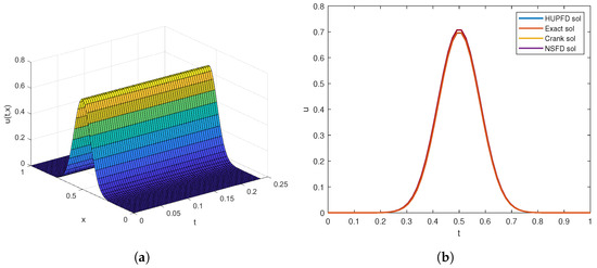 The infinity norms of the proposed HUPFD are compared with the UPFD and NSFD methods in solving the linear ADR equation, as shown in Table 6. The findings indicate that the HUPFD approach achieved slightly high accuracy (Figure 3 and Figure 4).