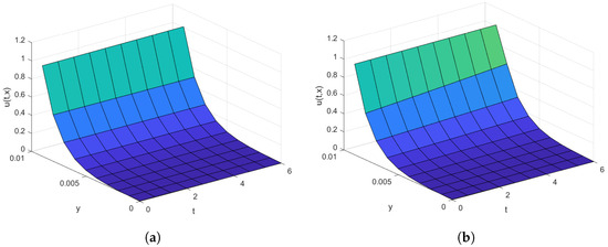 In this section, we set , and in Equation (58), which yields the nonlinear reaction diffusion equation given below: