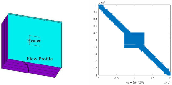 Consider the thermal convective flow control systems in [23,30,31]. These problems involve a flow region with a prescribed velocity profile, incorporating convective transport. Achieving solution accuracy with upwind finite element schemes typically requires a considerable number of elements for a physically meaningful simulation. In the illustrated scenario (see the left side of Figure 4), a 3D model of a chip is subjected to forced convection, utilizing tetrahedral element type SOLID70 as described by [34]. Both the Dirichlet boundary conditions and initial conditions are set to 0.