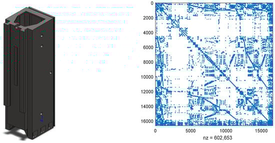 Consider the structurally vertical stand model from machinery control systems, depicted on the left side of Figure 5, representing a segment of a machine tool [30]. In this structural component, a set of guide rails is situated on one of its surfaces. Throughout the machining process, a tool slide traverses various positions along these rails [32]. The model was created and meshed using ANSYS. For spatial discretization, the finite element method with linear Lagrange elements was employed and implemented in FEniCS.