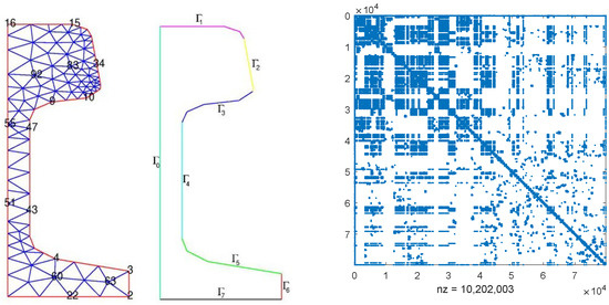Consider a semi-discretized heat transfer problem aimed at optimizing the cooling of steel profiles in control systems, as discussed in works by [23,30]. The order of the models varies due to the application of different refinements to the computational mesh. For the discretization process, the ALBERTA-1.2 fem-toolbox [33] and the linear Lagrange elements are utilized. The initial mesh (depicted on the left in Figure 6) is generated using MATLAB’s pdetool.
