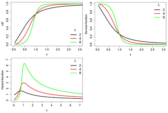 As an illustration, plots for the cdf, survival function, and hazard rate function in the SEFr model are given in Figure 2.