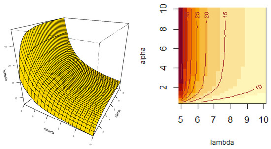 In Figure 3 and Figure 4, plots and contour plots for the skewness and kurtosis coefficients in the SEFr model are given. These plots suggest that for fixed and an increasing value of the skewness and kurtosis coefficients decrease quickly. On the other hand, for fixed and decreasing values of , the skewness and kurtosis coefficients decrease quite slower.