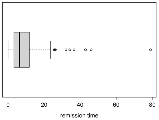 The remission times (in months) of 128 patients with bladder cancer are considered as first application. This dataset was first studied by Lee and Wang [47]. Table 3 provides the descriptive summaries. These are: sample mean, sample standard deviation (S), sample skewness coefficient () and sample kurtosis coefficient (). Also, the boxplot is given in Figure 5. We highlight the high values of the skewness and kurtosis coefficients, and the existence of possible outliers in this dataset.
