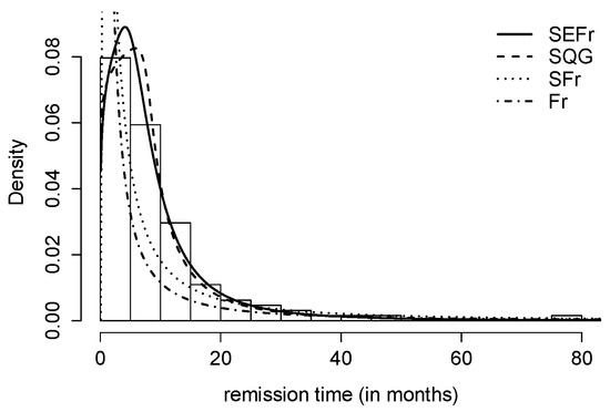 Fitted pdf for the remission times of patients with bladder cancer dataset in the Fr and SFr, SQG, and SEFr distributions.