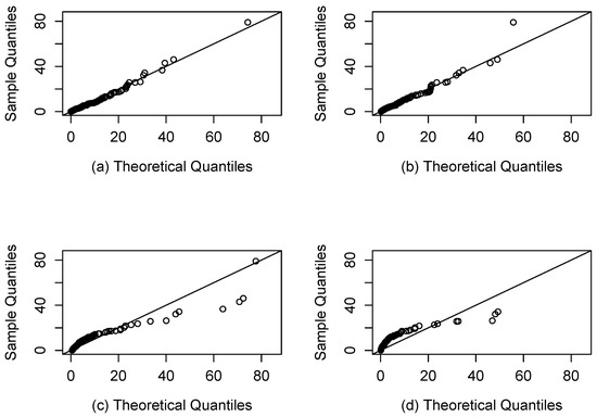 QQ plots for Air Conditioning System Failures dataset: (a) SEFr Model; (b) SQG model; (c) SFr model; (d) Fr model.