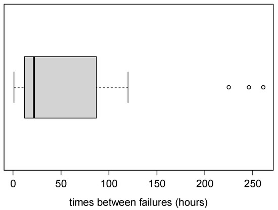 The second dataset was first studied in Proschan [48]. It consists of the time interval (in hours) between successive failures of the air-conditioning system of Boeing 720 number 7912. Table 5 provides the descriptive summary and Figure 8 the corresponding boxplot. Note the presence of outliers and that a model with a long right tail seems appropriate. These summaries suggest that the proposed distributions can be good candidates for modelling this dataset.