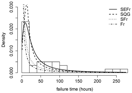 The histogram and the fitted pdf’s for the previously mentioned distributions are given in Figure 6. In Figure 7, the corresponding QQ-plots can be seen. Both graphical summaries support our conclusions about the good fit of SEFr model to this dataset.