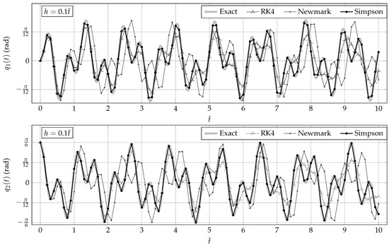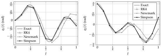 Configuration parameters’, , evolution for the linear double pendulum. Initial conditions are specified in Table 1. The step size is fixed as . Simpson’s integrator tracks the exact solution with more precision than Newmark’s method and Runge–Kutta’s integrator.
