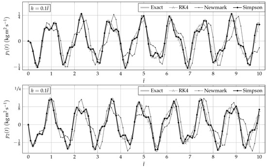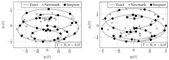 Figure 2 and Figure 3 show that Simpson’s integrator is more precise than both Newmark’s and Runge–Kutta’s integrators on a short simulation (). However, Simpson’s solutions correctly follow the exact ones for longer simulations on both the configuration parameters and generalized momenta, as shown by Figure 4.