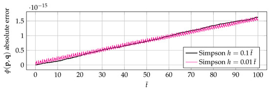 Figure 7 plots the absolute error on function of Equation (42), by Simpson’s scheme. The absolute error with respect to the initial value is minimal, in the order of , and may come from accumulated rounding errors. Note that this absolute error magnitude changes very little when refining the step size.