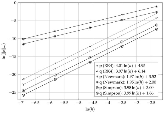 Convergence rates are expressed as the power of the step size. These rates correspond to the slope of the error logarithm, as a function of the logarithm of h (see Figure 8). These trials confirmed previous analyses on Newmark’s method [17,19]: it is second-order convergent. Unsurprisingly, Runge–Kutta’s integrator is fourth-order convergent. The results also confirm the analysis performed in [26] on the convergence rate of Simpson’s scheme: it is fourth-order convergent. This rate is two degrees higher than the order of the chosen quadratic interpolation. This is known as superconvergence and is closely related to the mesh uniformity [16].