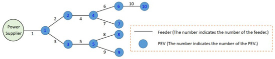 - To take into account the flexible property of PEVs to a greater extent; unlike the interactions considered by the V2G mechanism [20], we employ a novel interaction mechanism between PEVs and SCS, which integrates the V2V mechanism to allow the interaction between PEVs. At the same time, in order to reduce the duration of the total SCS load peak and minimize the cost to the PEV owner, we develop a non-cooperative game framework that considers distribution feeder overload constraints and propose a novel price-driven charging control game that considers both minimizing charging costs and reducing feeder overload and avoids grid collapse.