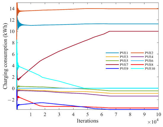 - To solve the generalized Nash equilibria problem (GNEP) considered in this article, we employ a distributed algorithm based on forward–backward operator splitting methods [30,31,32]. Using this algorithm, we can simultaneously treat the inequality constraints and the equality constraints in GNEP. We put together the constraints of all PEVs in GNEP from a global perspective, putting the local constraints into the global coupling constraints, and then treating the inequality constraints in GNEP together. Simulation results verify the effectiveness of the algorithm.