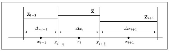 We employ a cell-centered finite volume approximation for the spatial discretization (see [29], for example) and proceed by considering a non-uniform grid. Thus, let be the finite volume centered at , for , where N is a fixed number of vertices on the one-dimensional grid. Let us assume that is the spatial grid size, from which is the length for an interfacial interval (see Figure 1).