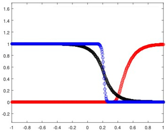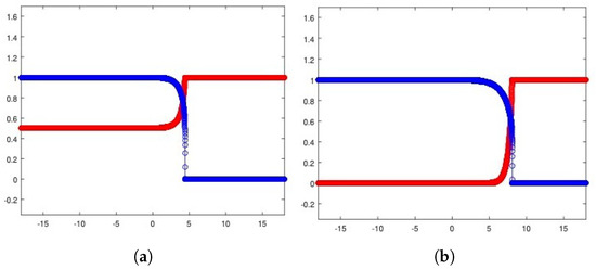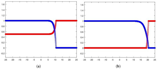 Our reduction (13) is a degenerate reaction-diffusion equation as in (8) and the diffusion h is almost everywhere differentiable, due to the discontinuity located in for the derivative. The existence and uniqueness results for traveling waves of sharp/smooth-type available in [17] require at least the pointwise differentiability in , so that, strictly concerning the theoretical point of view, it is not possible to state the sharpness/smoothness of the fronts for Equation (13). As a matter of fact, we keep relying on the numerical assessment in this paper, although the possibility of employing a smooth approximation for bypassing the discontinuous point of , so that enough regularity [17,20] might be ensured, would not seem to jeopardize a theoretical prediction of existence and uniqueness for the fronts in the case of (14) as well.