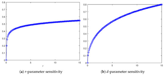 We conclude this section by performing a sensitivity analysis with respect to the parameters r and d. In order to accomplish this purpose, we consider as unknown the wave speed s, whose numerical approximation is provided by invoking the space-averaged estimate proposed in [16], already successfully exploited in the Gatenby–Gawlinski model field in [15], to which we refer for the detailed derivation. The final discretized version, providing the approximation for a function v over a uniform spatial mesh at time , is the following: