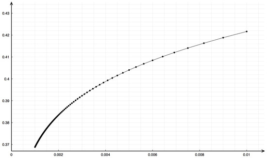 Emphasis should be given to the mesh dependence upon space discretization. Indeed, computing the propagation speed with the LeVeque–Yee formula (11) using different values of gives different values. In Figure 9, the dependency in the plane is shown with a remarkable concave behavior for small .