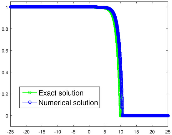 where . Assuming the previous choice , it follows that , which is a threshold very close to our numerical estimate . For the sake of completeness, we provide a graphical check as well, the plot being depicted in Figure 13. We have chosen to exploit a refined spatio-temporal mesh, namely, and , compared to the parameters listed in Table 3, with the aim of achieving a very effective graphical result. The resulting trajectories are very close and the wave speed approximation is good too, being .