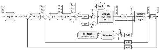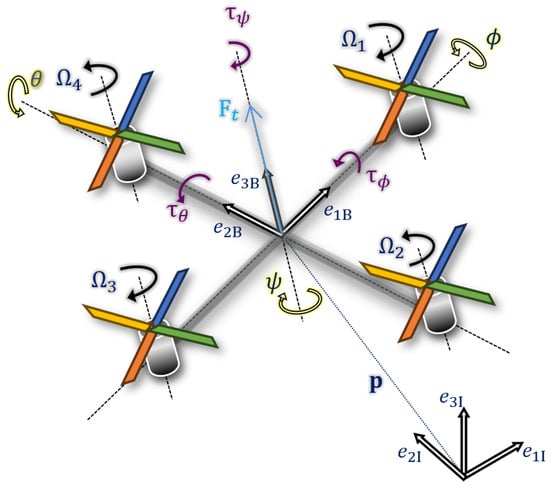 with denoting, respectively, the roll, pitch, and yaw angles. The position of the quadrotor in the earth-fixed coordinate frame is described by the vector denoting, respectively, the longitudinal, lateral, and vertical axes. The parameter is the rotor inertia, while , , and are the diagonal entries of the quadrotor’s inertia matrix. The parameter l is the length of the lever, while m and g are, respectively, the mass and the Earth’s gravity.
