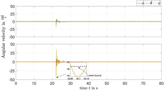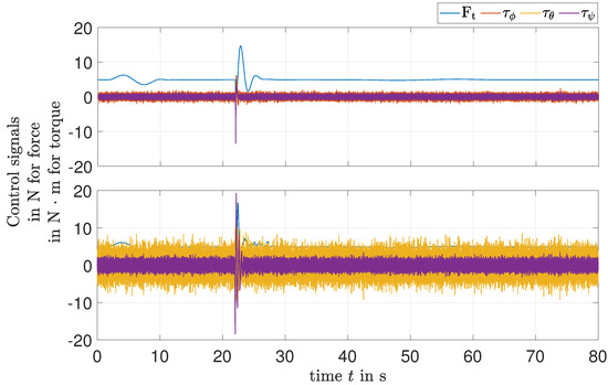Figure 4 shows the attitude responses. It can be seen that the curves return to a steady state quickly with both methods. In the LMI-based response, throughout s, the yaw angular velocity violates the polytopic model bounds used to represent the state dependencies in Equation (5). The inputs applied to the quadrotor model are shown in Figure 5.
