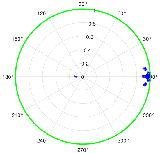 Since the stability condition established in the LMI framework may be conservative, the eigenvalues of the matrix at the times s are checked to be inside the unit circle. By taking the input of the inner-loop, which corresponds the output of the prefilter and the output of the attitude model which are the angles in Figure 2, a linearized model of the inner observer-based control loop is obtained with the help of Matlab’s function. The resulting eigenvalues of the discretized inner control loop are shown in Figure 6, where all eigenvalues are inside the unit circle of the complex z-plane