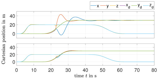 To configure the trajectory planning, the degree parameter in Equation (15) is chosen as . So, in the time intervals s, s, and s, the first five vector entries in Equation (17) are chosen equal to the desired initial Cartesian coordinates, and the last five entries are set to the desired final Cartesian coordinates.