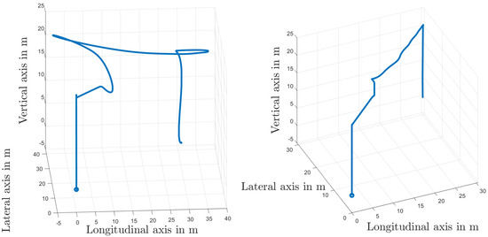To validate the behavior of the quadrotor model further, a second trajectory is chosen that does not violate the predefined range of angular velocities. An actuator fault is additionally assumed to occur, which leads at the same time to deviations in the yaw torque of Nm, Nm in the roll torque , and N in the total thrust . The gains for the PI/P controllers were optimized for each of the two design methods with the weighting parameter . For the LMI-based simulation, the parameter values of the PI position controller are obtained as for the proportional gain, and for the integral gain, while the value of the P velocity controller is obtained as . For the EKF-based LQR simulation, the values of the PI position controller are obtained with for the proportional gain and for the integral gain, while the value of the velocity P controller is obtained as . For the variance in the Gaussian output noise , the value was chosen for all three components.