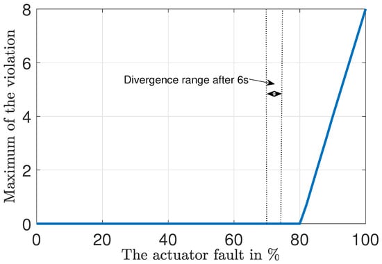 To evaluate the influence of the actuator fault magnitude on the system dynamics, Figure 9 visualizes the maximum violation of the angular velocity intervals of the polytopic model right after the appearance of the actuator fault. The visualization is performed by scaling all fault components simultaneously within the range of [0;100]%.