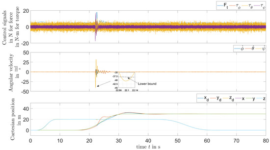 Consider firstly a surveillance mission, where the scenario is to take off vertically, go slowly horizontally, and then vertically land. After 22 s, an actuator fault occurs, which leads at the same time to deviations in the yaw torque of Nm, Nm in the roll torque , and N in the total thrust . Those values were chosen to reflect severe faults in this simulation analysis to validate the control procedure for worst-case operating conditions.