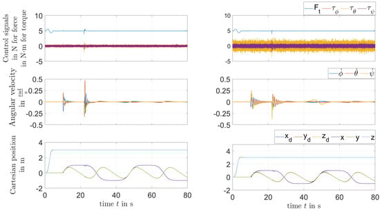 Responses of the quadrotor model for a lemniscate trajectory: left-hand side with EKF-based LQR; right-hand side with LMI-based method.