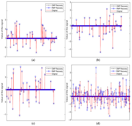 The recovery of an input signal for the OMP and the RMP under different sparsity levels k, different dimensions d, and different numbers of measurements N. (a) k = 40, N = 250, d = 512; (b) k = 40, N = 250, d = 1024; (c) k = 40, N = 250, d = 2048, (d) k = 125, N = 500, d = 5000.