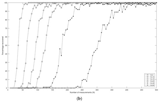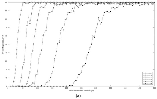 Figure 3 displays the relation between the percentage (of 100 input signals) of the support that can be determined correctly and the number N of measurements in different dimensions d. It reveals how many measurements are necessary to reconstruct a k-sparse signal with a high probability. A percentage equal to means that support for all 100 input signals can be found. That is to say, the support of the input signal can be exactly recovered. Furthermore, Figure 3 indicates that to guarantee the success of recovering the target signal, the number N of the measurements must increase when the sparsity level k increases.