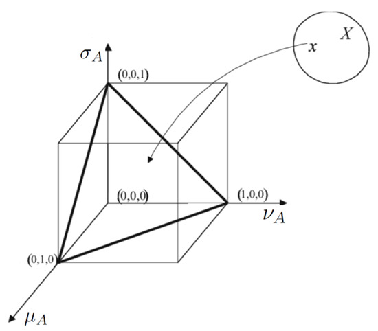 ([5]). Assume that is a classical set. Define a single-valued neutrosophic set (SVNS) Ω of as an object of the model