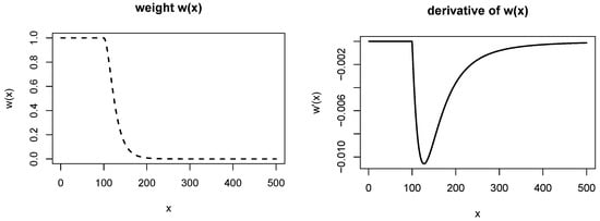 Weighted least squares estimation has been proposed and discussed in the literature, including the famous Huber’s M-estimators which, however, can have the lowest breakdown point if the derivative of the weight (or loss) function is non-decreasing; see [9] (p. 13) or [10,11]. For more discussions, see Section 1.2 of [9] or Section 5.11 of [10]. Previous weight functions in the literature are either constants (e.g., LS with 1, or LMS and LTS with 0 and 1 weight), rank-based weight, do not down-weight large residuals sufficiently, or non-differentiable. Among these weight-induced regression estimators, there are few that possess a high breakdown point (50%), a high efficiency, and a high computability, simultaneously.