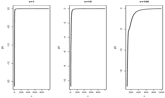 where the tuning parameter is a positive number (say, between 1 and 10) controlling the steepness of the exponential decrease (see the left panel of Figure 1), where the larger the k, the steeper the curve (the key difference from the trimmed procedures where the weight becomes zero). Tuning parameter c is the point where the weight function will change from a constant one to being exponentially decreasing. c (>1) usually can be set to be a large positive number (say 10), or it can be residual dependent, say 50% or 75% percentile of the residuals, and a larger c is favorable for higher efficiency. c is assumed to be finite to exclude the LS case (i.e., will not be a constant one).