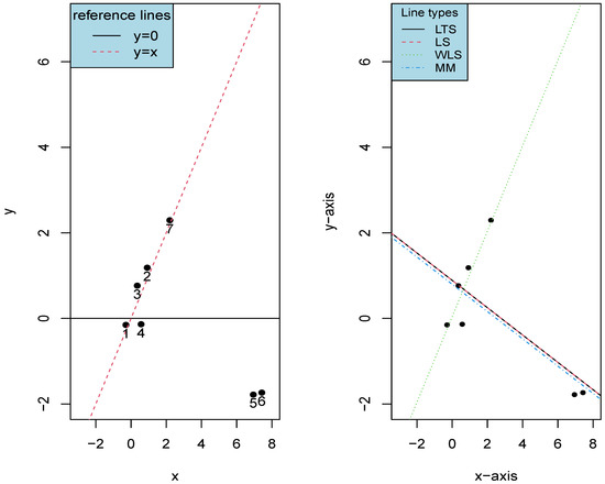 We generated a data set with seven artificial highly correlated (with correlation between x and y) bi-variate normal points. It is plotted in the left panel of Figure 4. Two reference regression lines () and () are also provided.