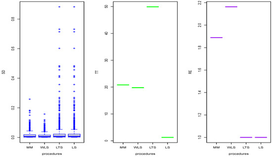 Inspecting the table reveals that (i) WLS and LS produce the same for each sample, so there is no variance, whereas this is not the case for MM and LTS. (ii) LS is the fastest runner followed by MM, LTS, and WLS. (iii) The relative efficiency of MM and LTS is 0% since the sample variance of LS is 0, whereas the RE of WLS and LS is undefined (not a number) since 0 appeared in the denominator. On the other hand, one can interpret WLS as being as good as LS in this case with RE 100%.