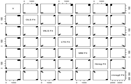 With great help from Dr. Olive, we were able to have the pairwise scatter plots of points of , namely, fitted values versus observed values and fitted values versus fitted values of different methods. The plot is given in Figure 7 (lms is omitted; it performs much the same as most other robust ones).