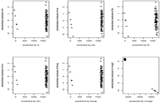 To better understand the performance of the six methods, we produced a classic fitted value versus the standardized residuals plot in Figure 8, which clearly identifies five outliers and performance difference between the six methods (rmreg2 performs remarkably different from all others).