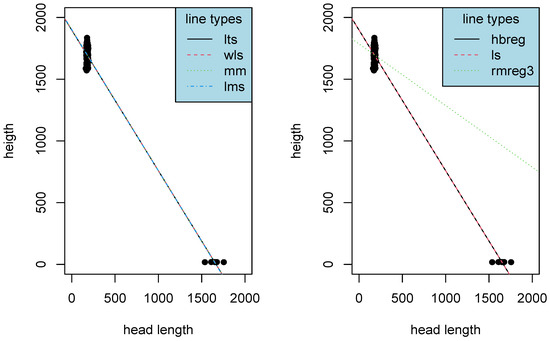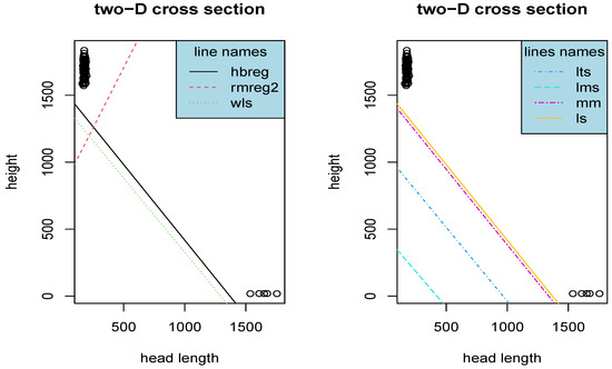 We list in Table 3 the output of the methods (mm, lts, lms wls, ls, hbreg, and rmreg2), where the last two methods are proposed by Olive and Hawkins (2011) and Olive (2017) [20,22], respectively.