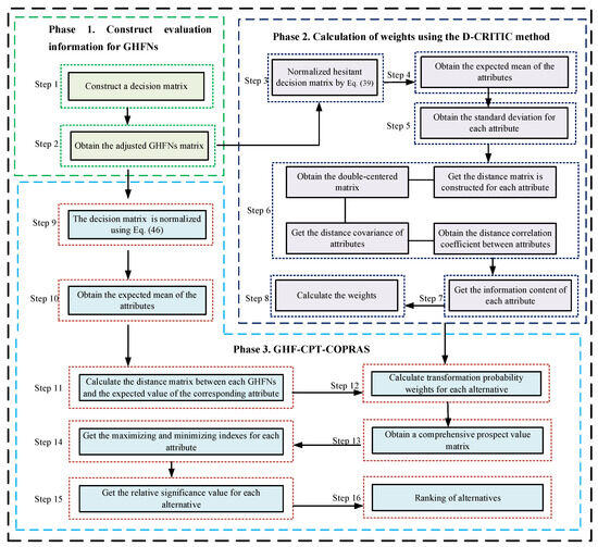 The problem with MADM is how to fuse and rank the evaluative information being processed. The COPRAS method is capable of considering the importance and validity of various alternatives in the process of evaluating and ranking them, and its calculation process is simple and transparent. Therefore, this method is widely used in MADM problems. Seker, Baglan, Aydin, Deveci and Ding [22] used the IVq-ROF-COPRAS method to evaluate COVID-19 social risk factors. Mishra, Rani, Saha, Senapati, Hezam and Yager [23] proposed the COPRAS method for Fermatean FSs and applied the method to the selection of renewable energy sources. Naz, Akram and Muzammal [24] extended the COPRAS method to the 2-tuple linguistic T-spherical fuzzy MAGDM problem. Dang, Nguyen, Nguyen and Dang [25] proposed SFs Gray COPRAS (G-COPRAS) and applied it to the SSS problem. Buyukozkan and Gocer [26] proposed the PFS-COPRAS method and applied it to the MADM problem of partner selection. Yuan, Xu and Zhang [27] proposed a hybrid DEMATEL-COPRAS approach for probabilistic linguistic term sets and applied it to third-party supplier selection. Song and Chen [28] proposed the COPRAS method for the MADM problem in PHFS. The application of the COPRAS method in some other fuzzy environments is not listed [29,30,31]. However, until now, the application of the COPRAS method within the context of GHFNs has remained unexplored.